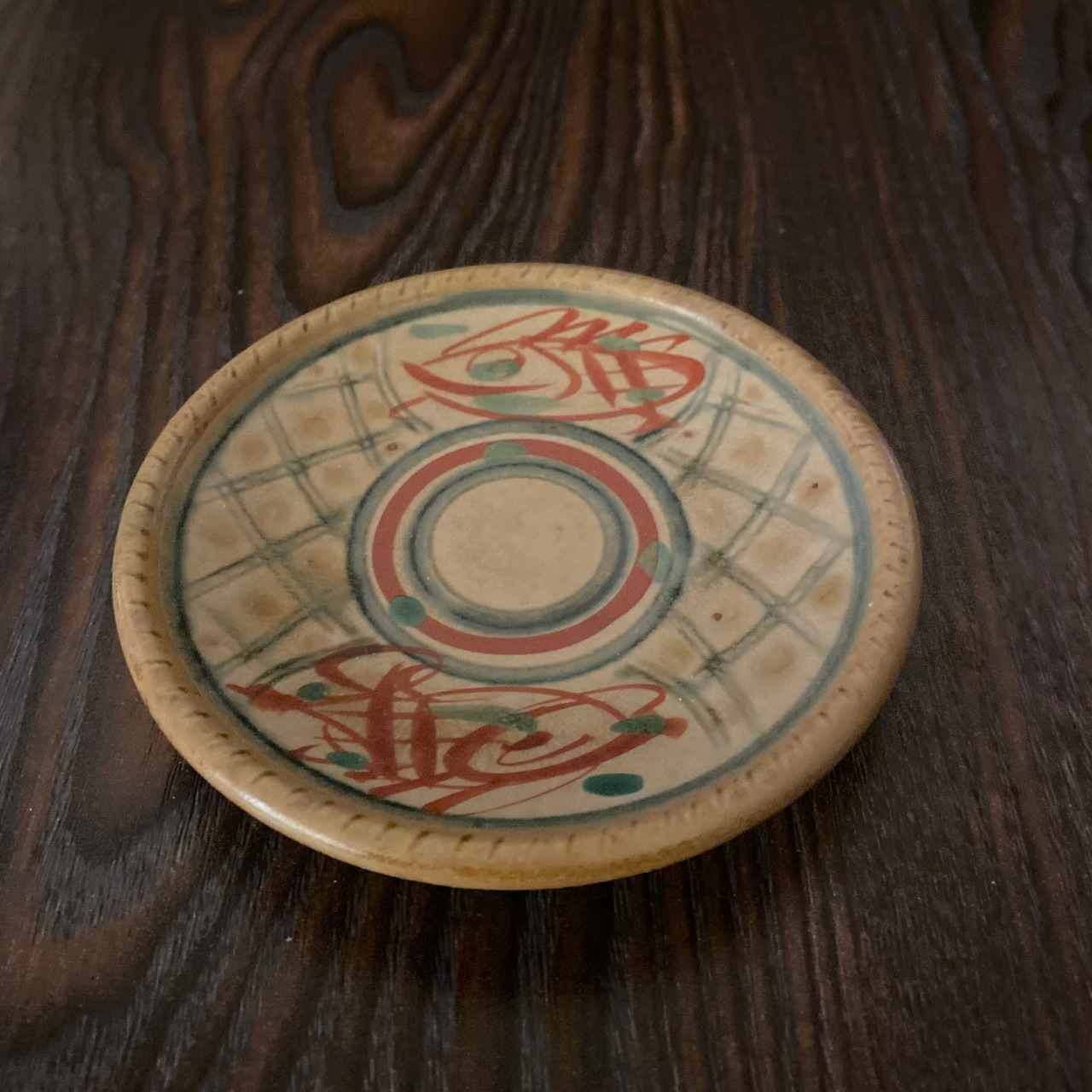 彫刻の入った浅いシンプルな丸皿は、重なりが良く収納にも便利です。手描きの独特の魚と網目の柄は、南国の雰囲気。同じ皿なのにロットによって色合が変わりまくるのも昭和っぽくて◎。サイズはΦ10.8cmです。