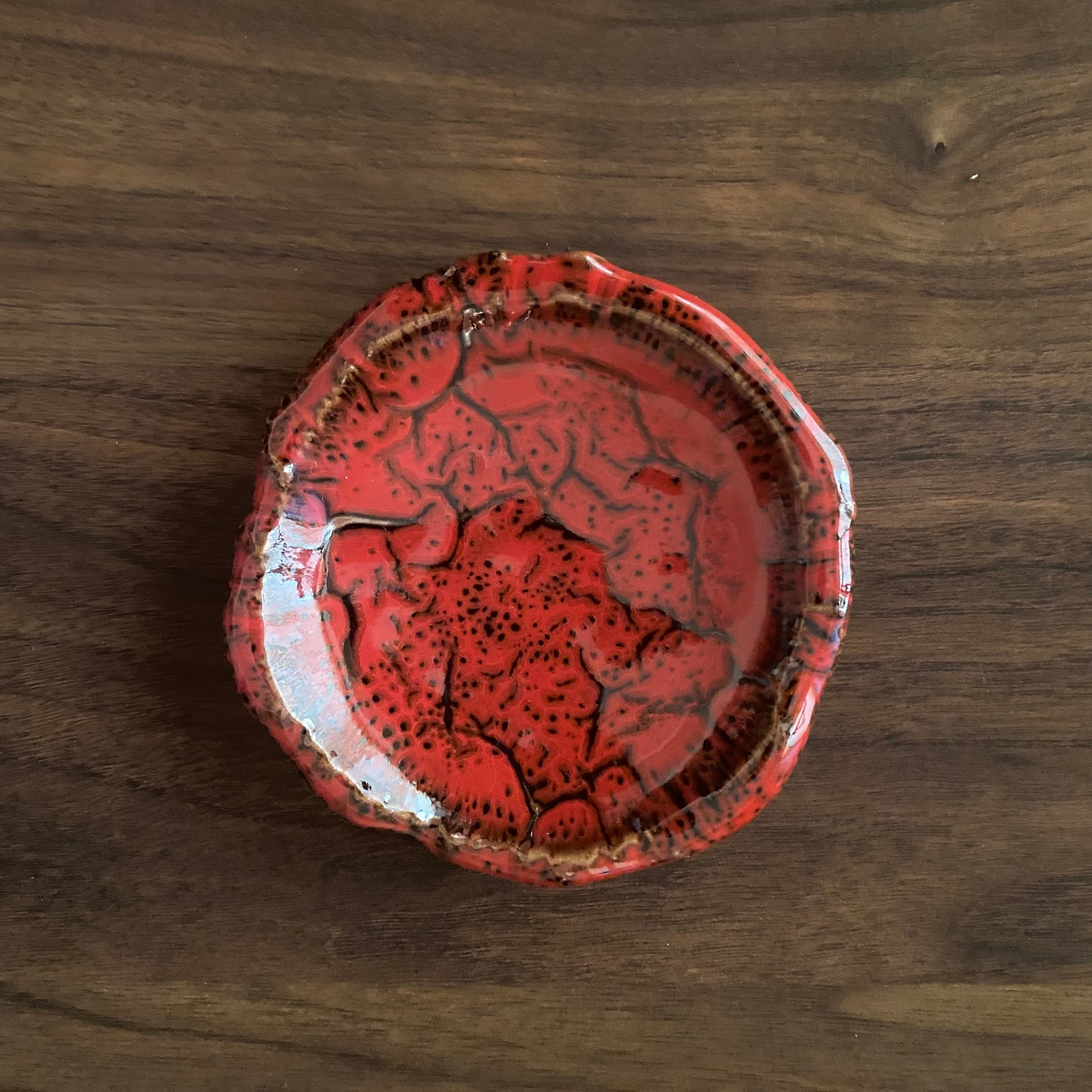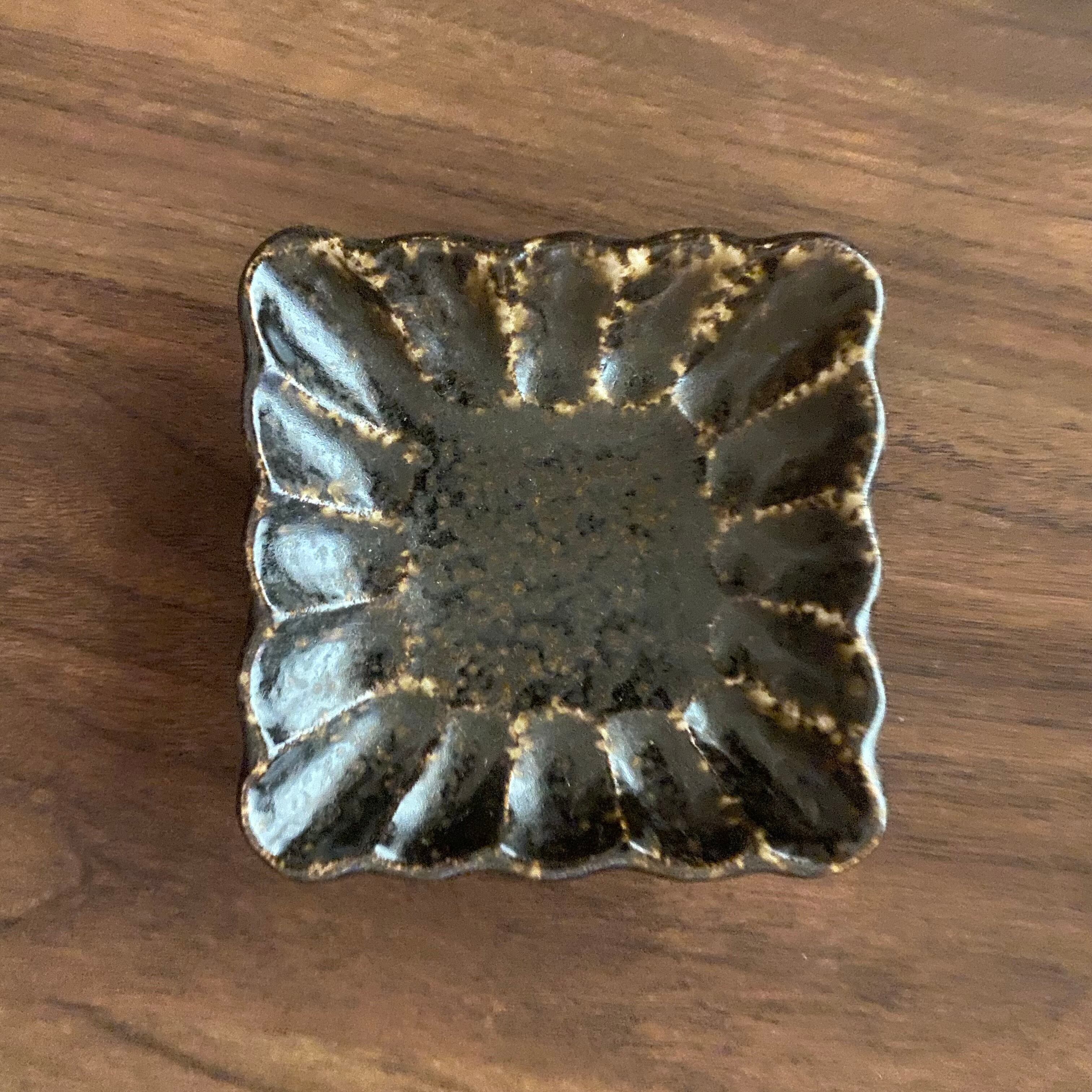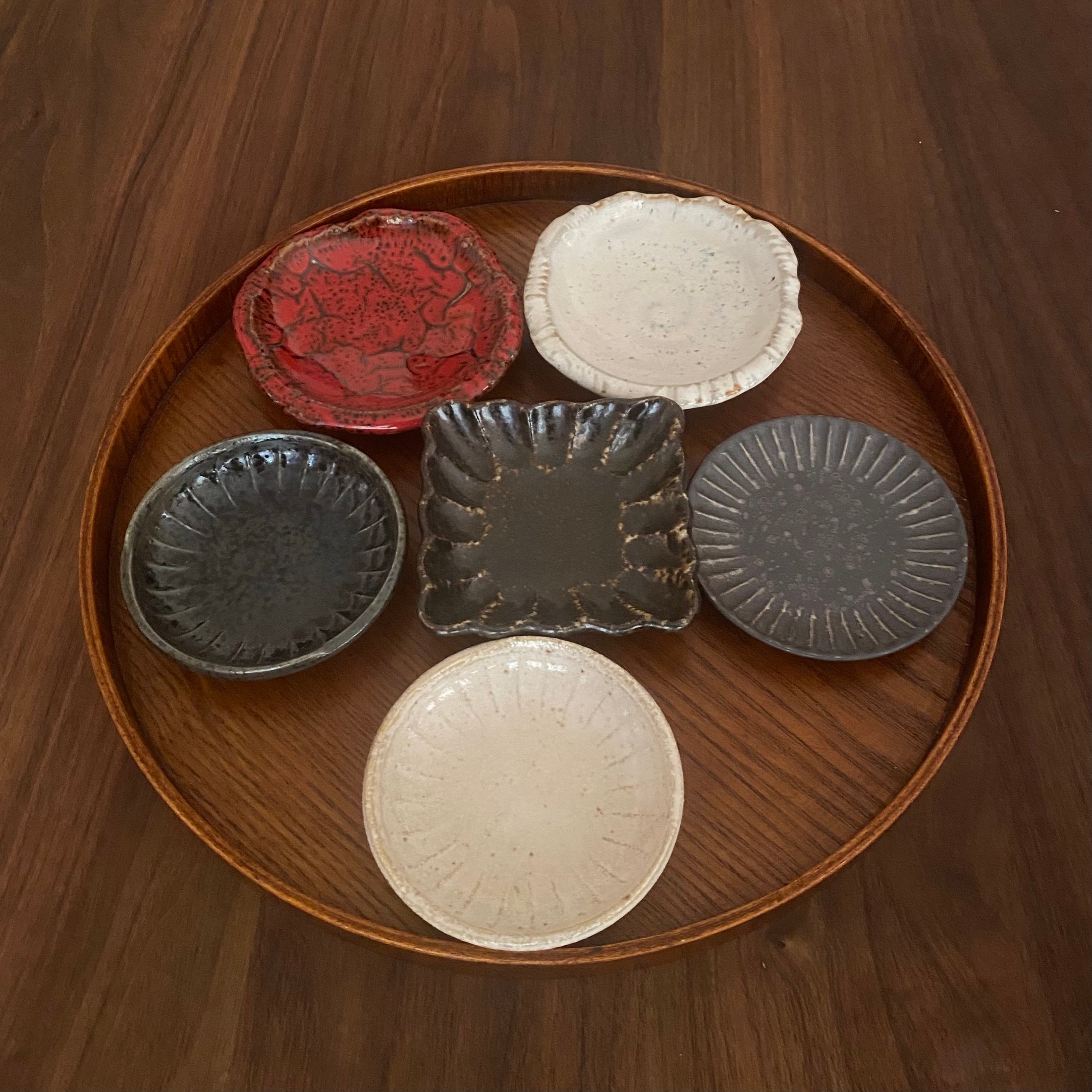 渕そぎ炎舞、渕そぎ白唐津、しのぎ溶岩流、梅花皮、孔雀変形リム、黒菊角皿の6種類。。サイズはΦ9.2-10.4cmです。