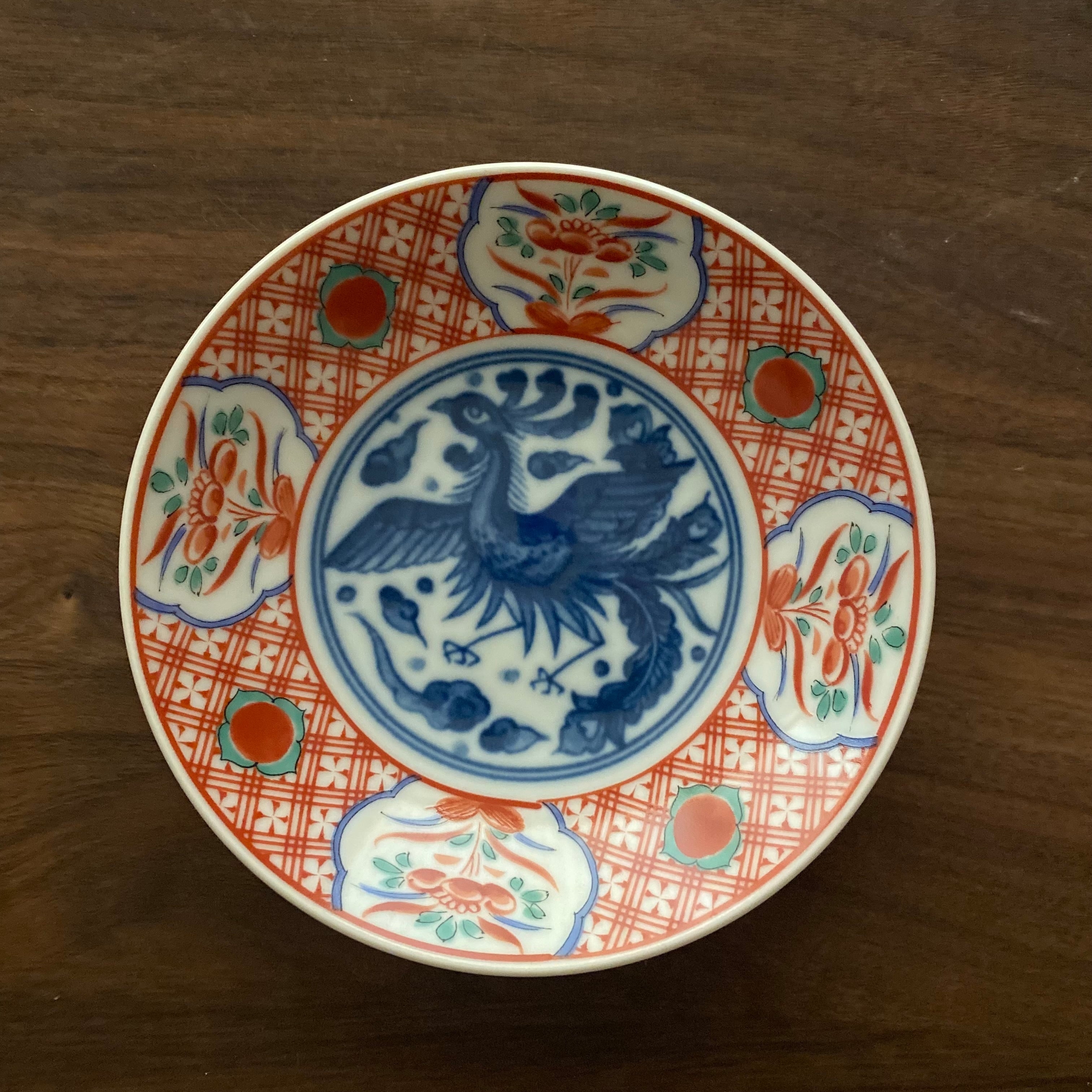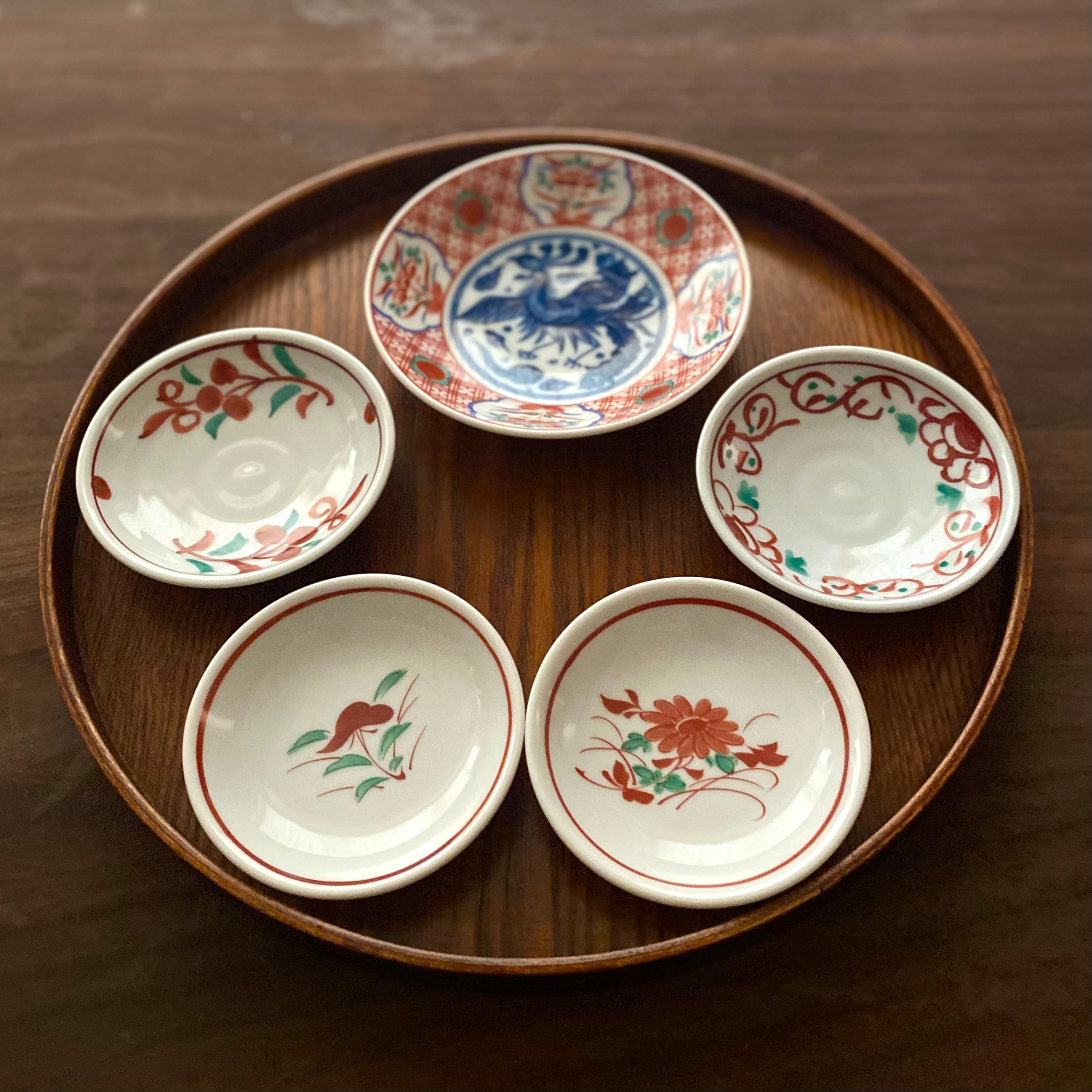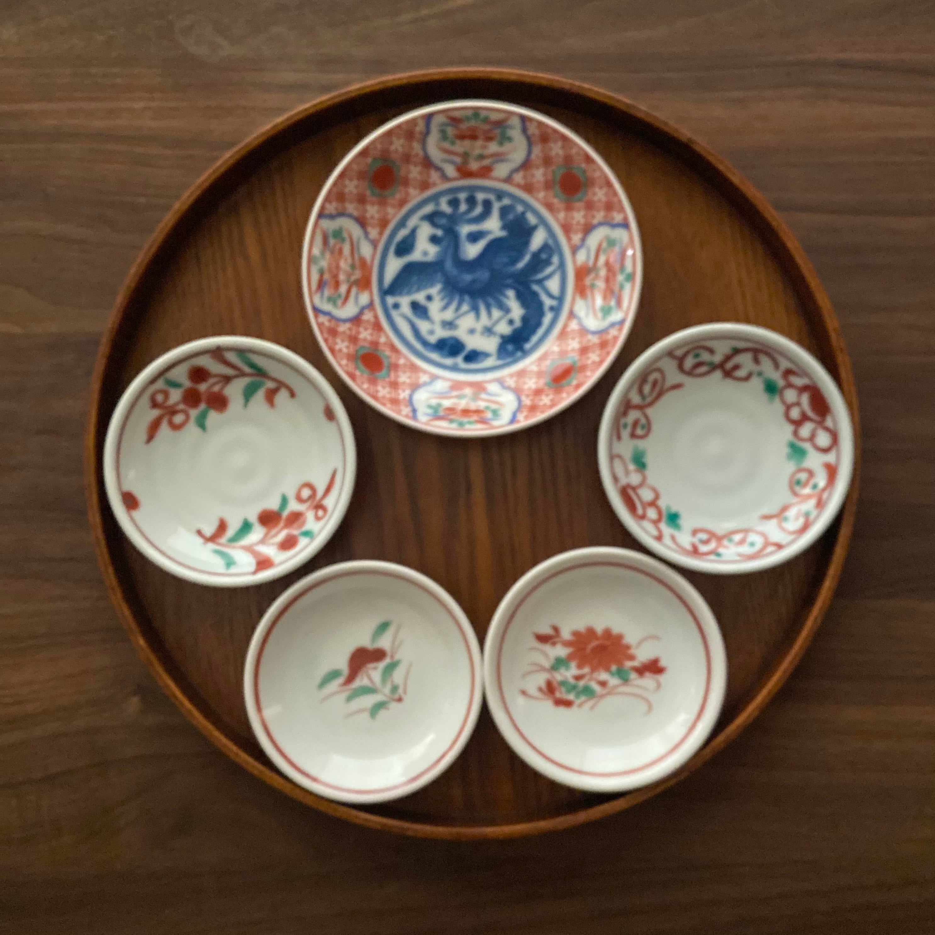 豆皿セット【赤絵異彩】。人気の赤絵模様が施された5枚セットです。呉須赤絵鳳凰、玉花絵、菊唐草、赤絵菊豆皿&花豆皿の6種類。サイズはΦ9.〜13cmです。