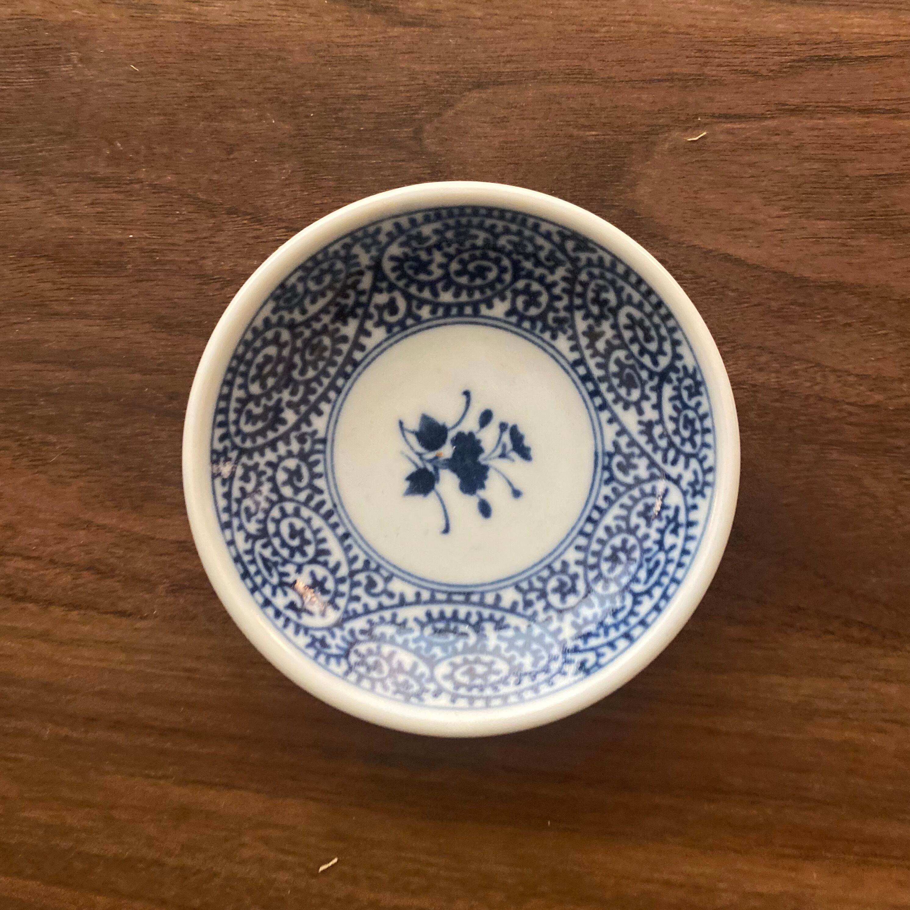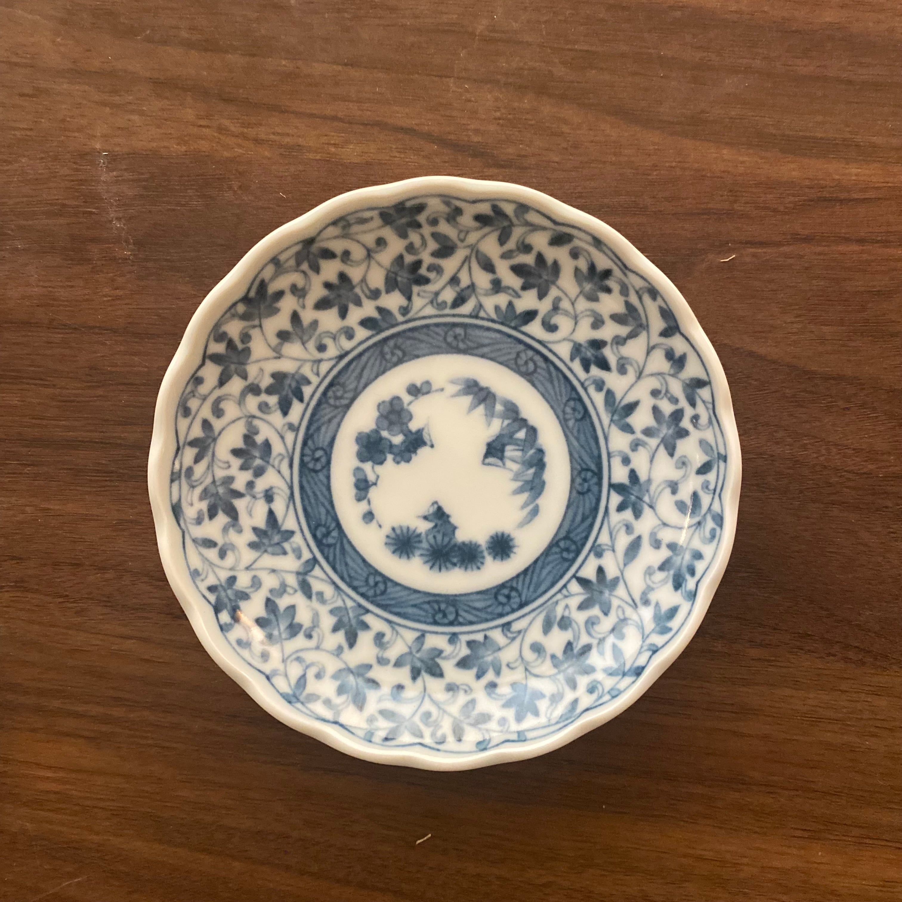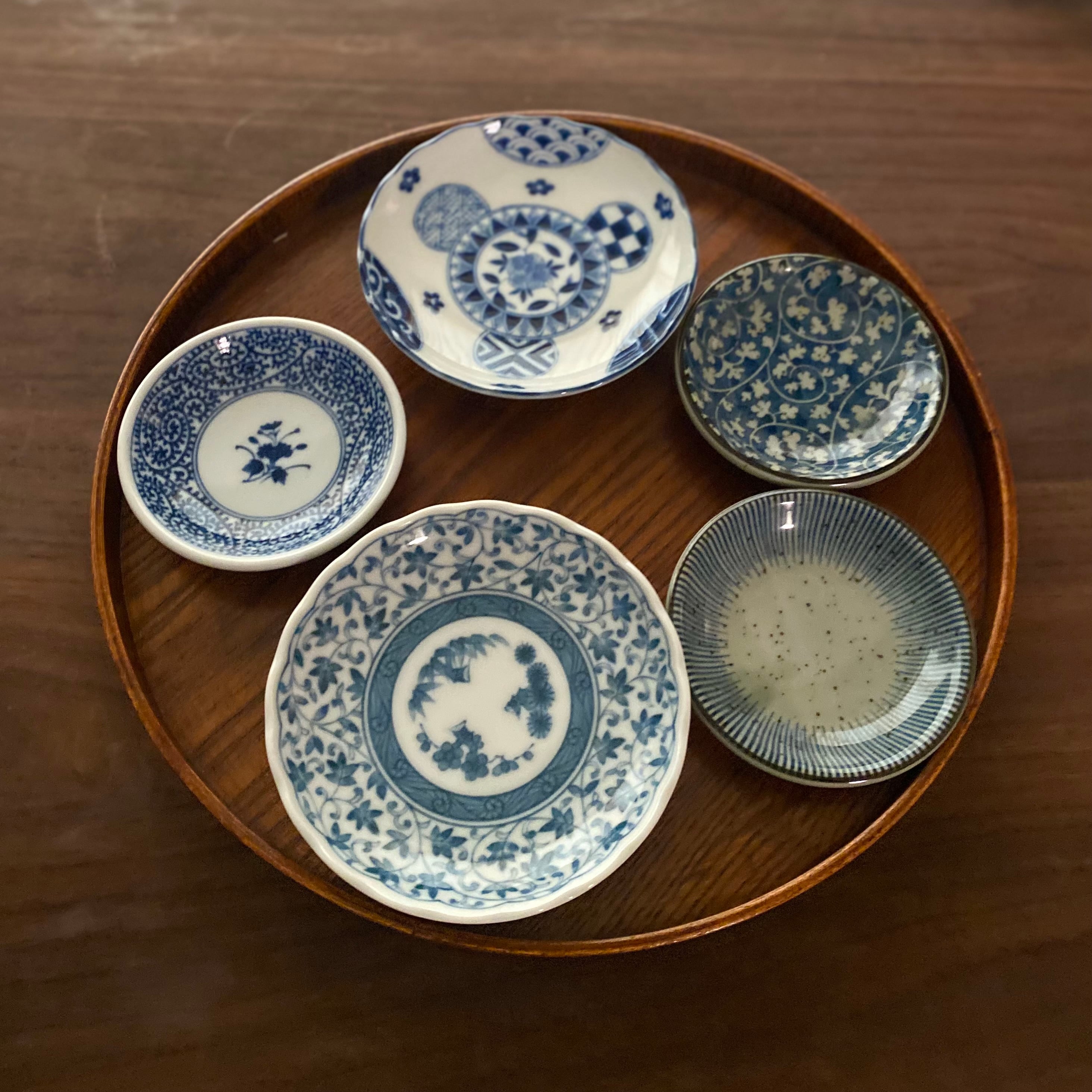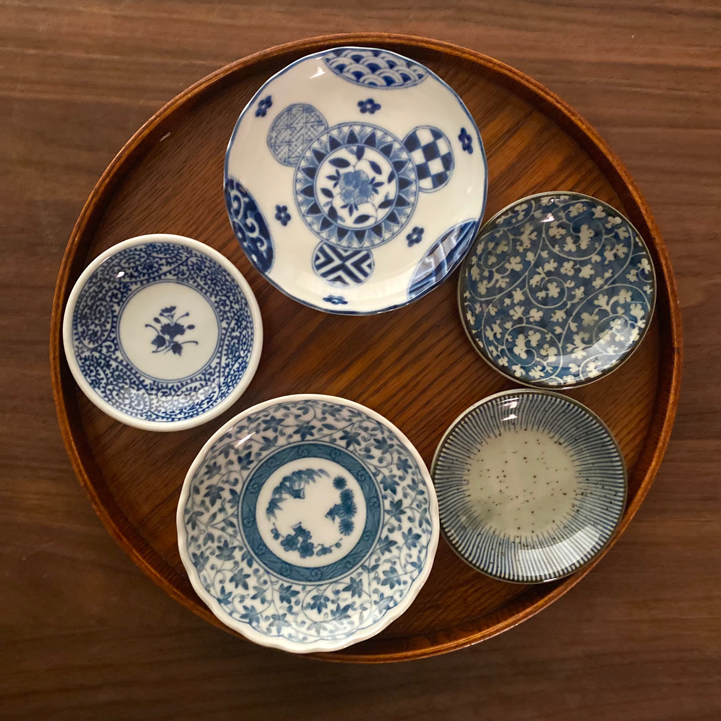 大小織り交ぜた豆皿5枚セット。藍丸紋菊型豆皿、蛸唐草2.8、益子十草、益子唐草、染付蛸唐草の5種類で、サイズはΦ9.0〜12.2cmです。