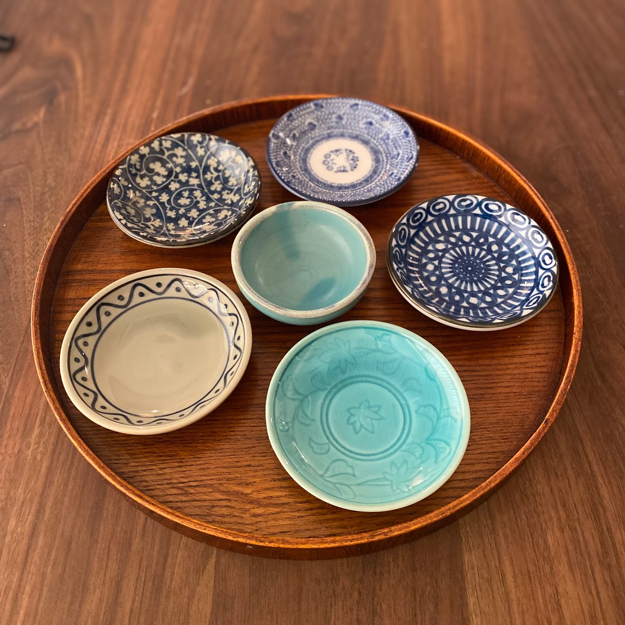 豆皿6個セット。人気の空色と藍色をメインとしたオリエンタルな柄のセットになっています。