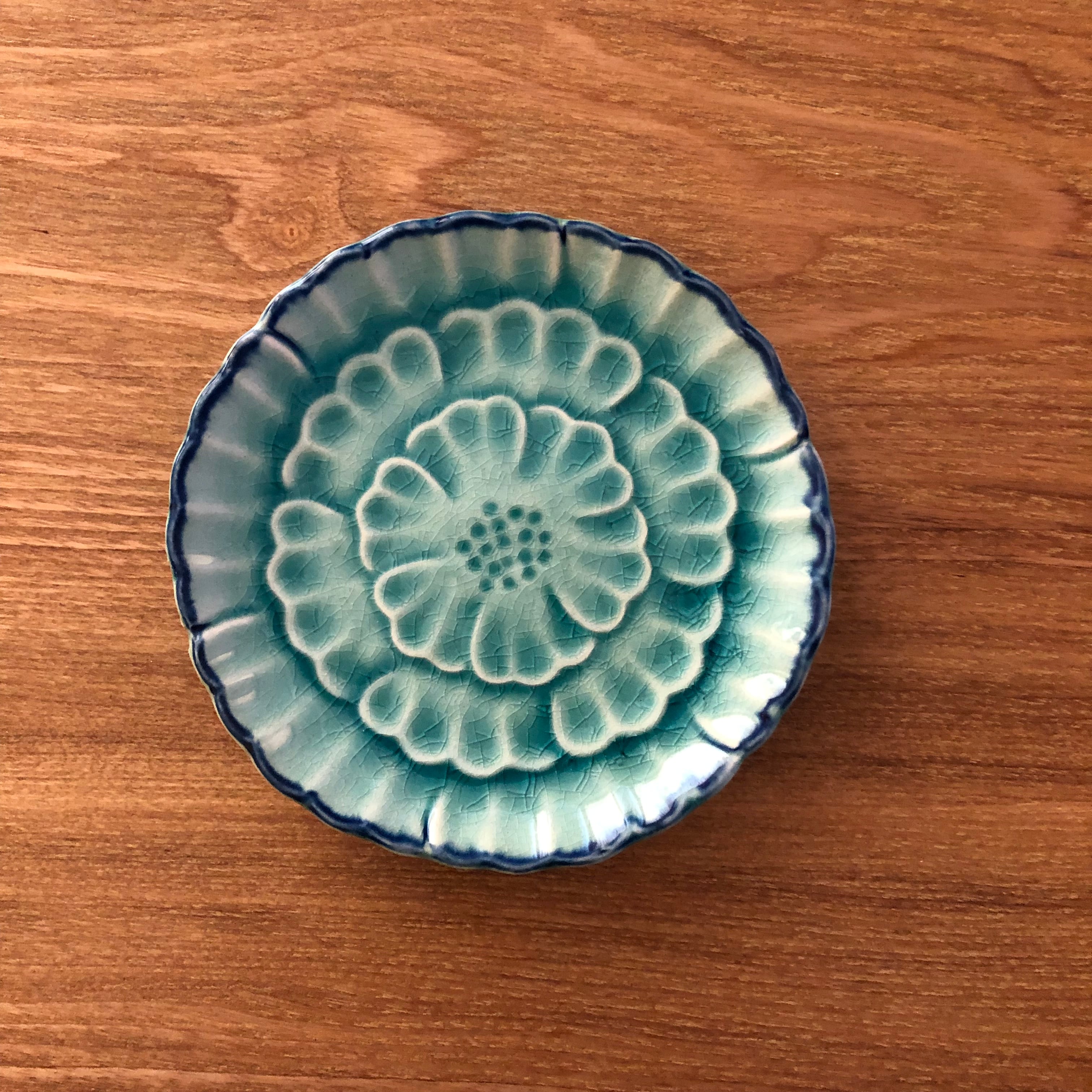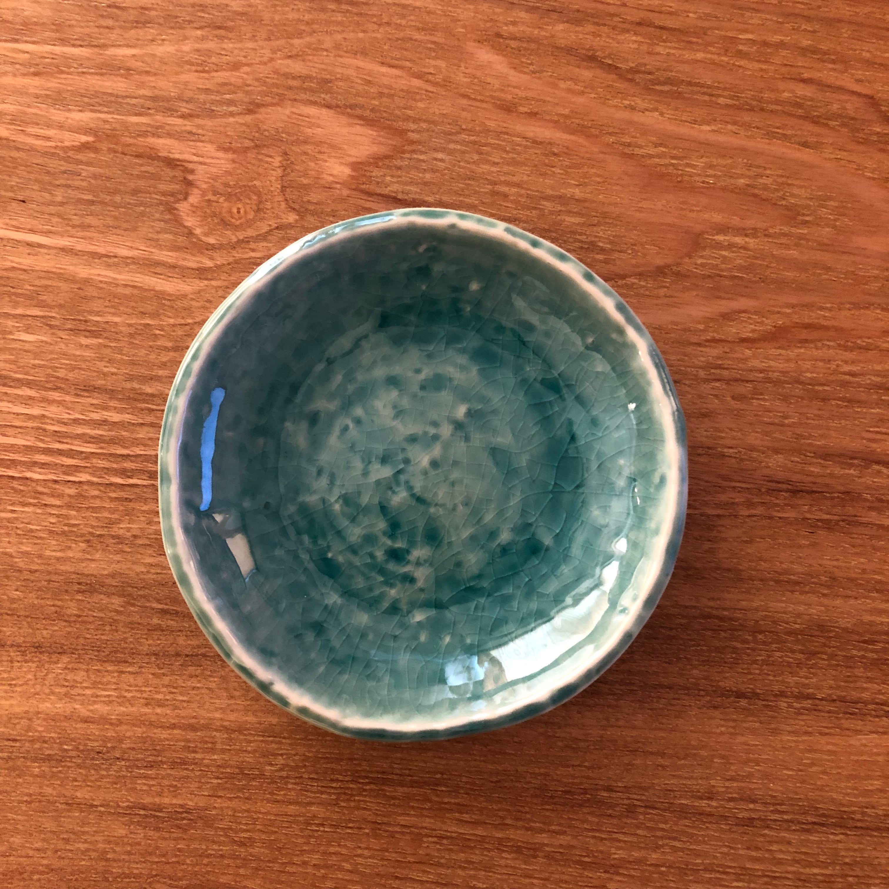 少し大きめ、四寸サイズの豆皿セット。人気のトルコブルーの組合せです。。トルコ3.5寸皿とトルコ貫入牡丹皿でサイズはΦ10.8と12.4㎝になります。