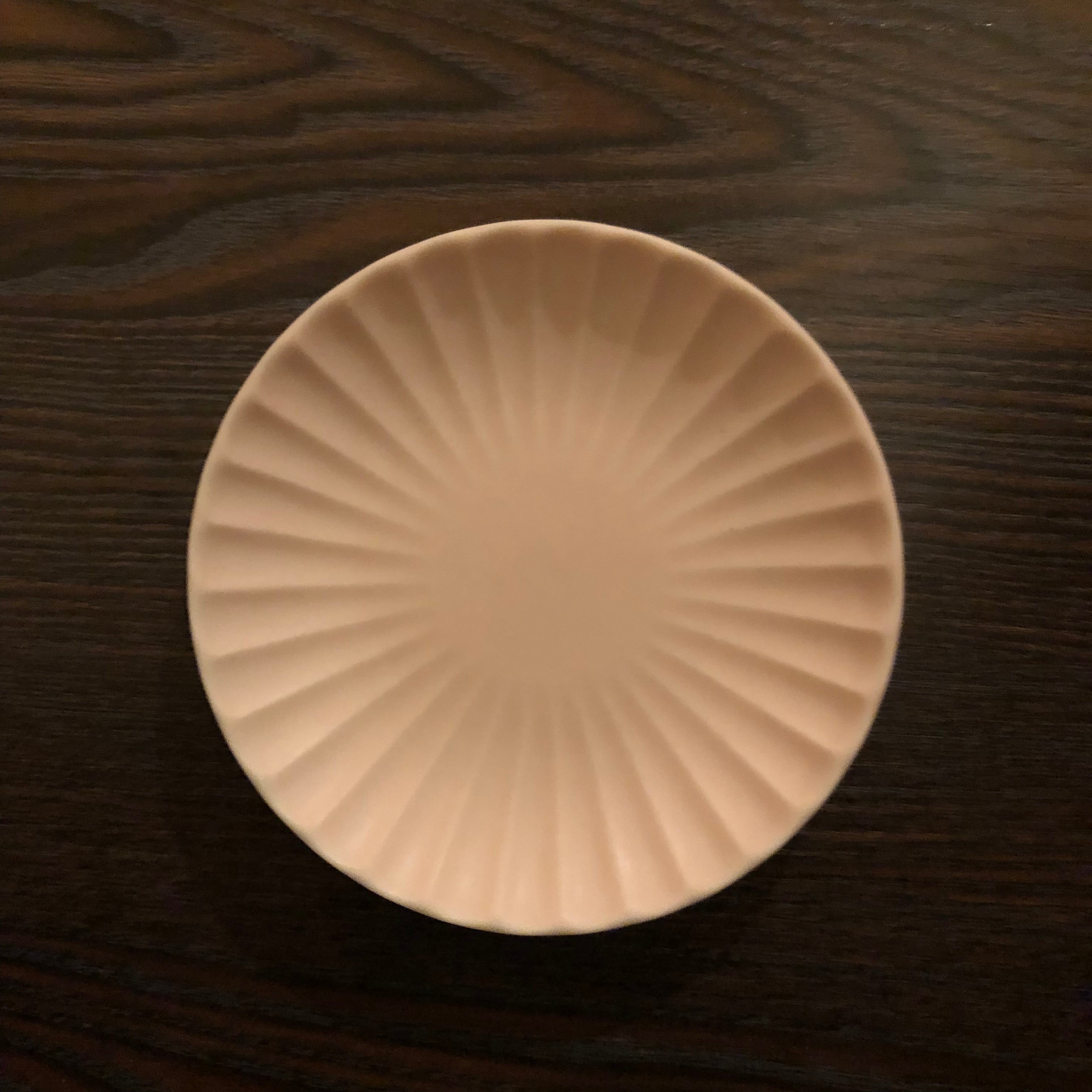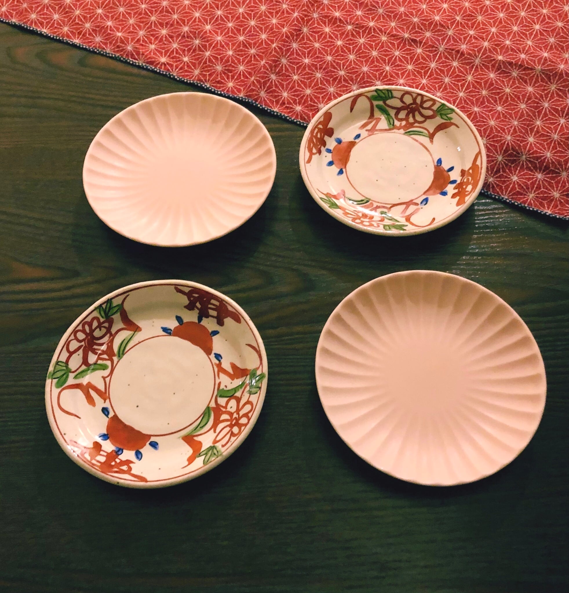 新品の豆皿4個セット。散ってしまった桜が戻ってきたような色合いの豆皿セットです。。しのぎ桜色と粉引手描万暦、サイズはΦ12.3cmです。