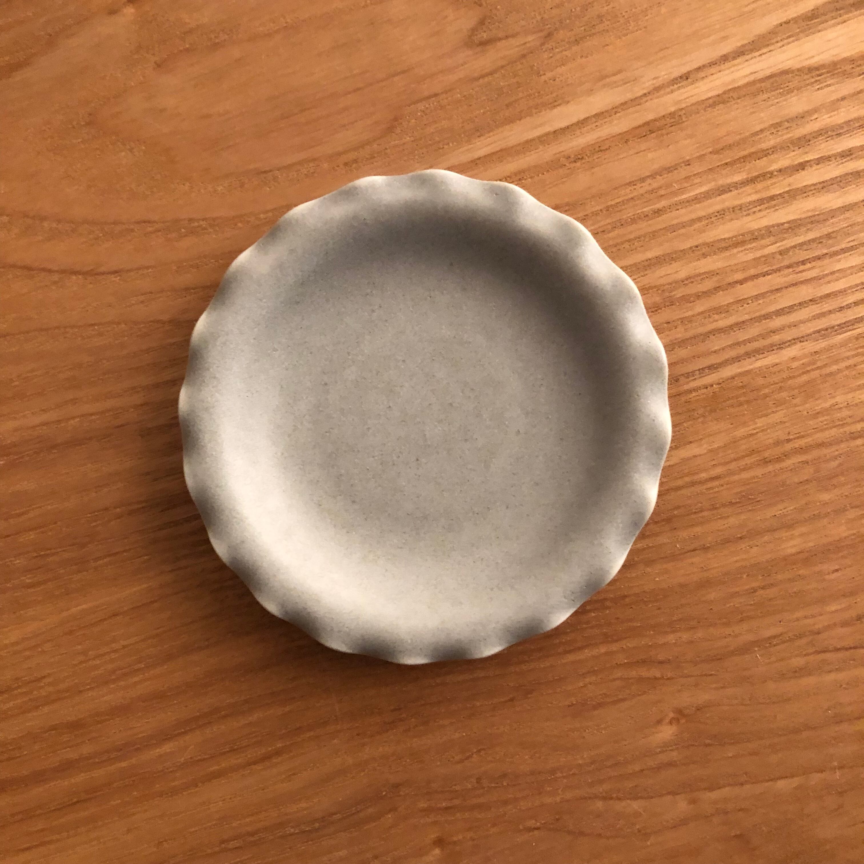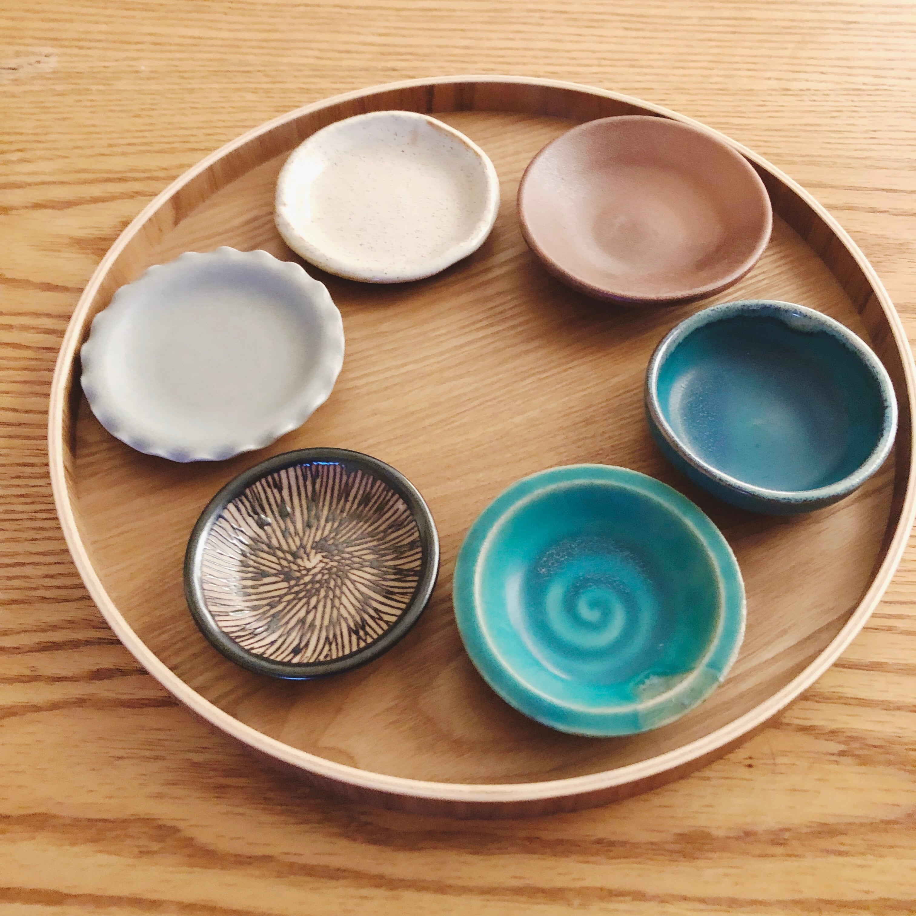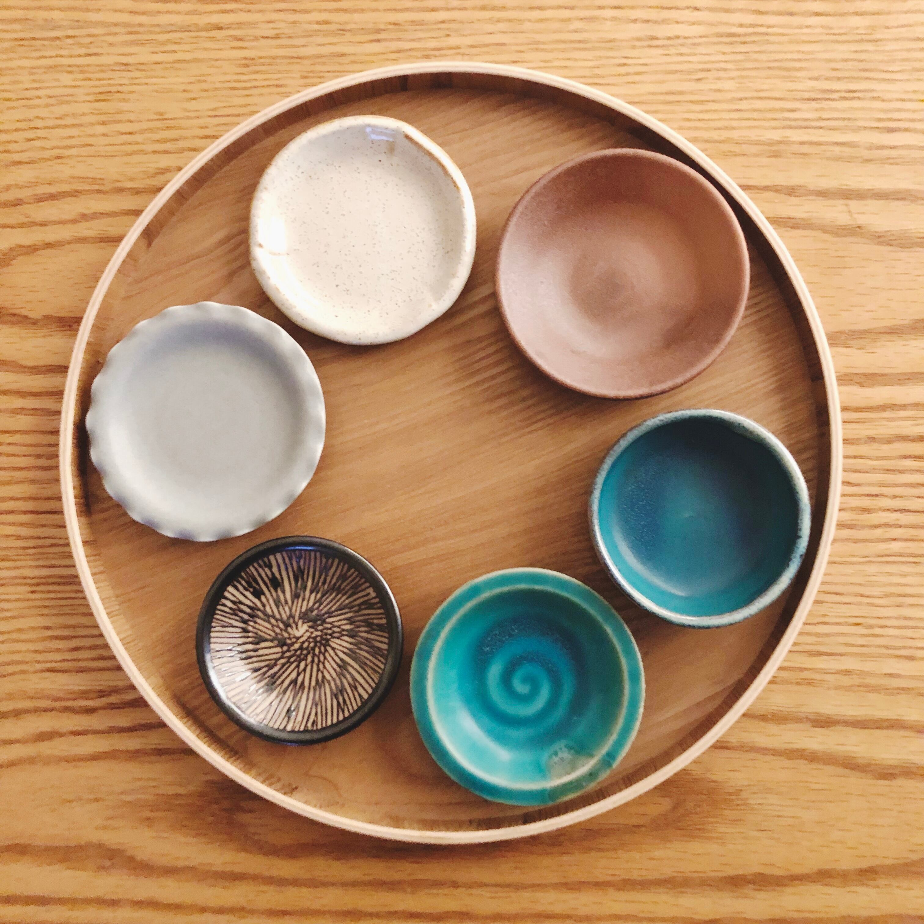 豆皿6個セット。艶のないトルコブルーと砂色の組合せです。トルコ薬味皿、トルコ小鉢、備前薬味皿、グレーフリル豆皿、茶粉引、伊賀櫛目の6種類。サイズはΦ8-9.6cmです。