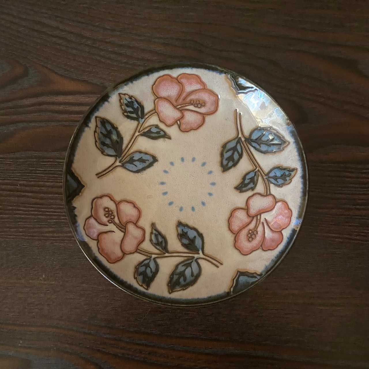 アカバナ(ハイビスカス)を描いたやちむん風のお皿です。。サイズは大きめのΦ16.5cmです。