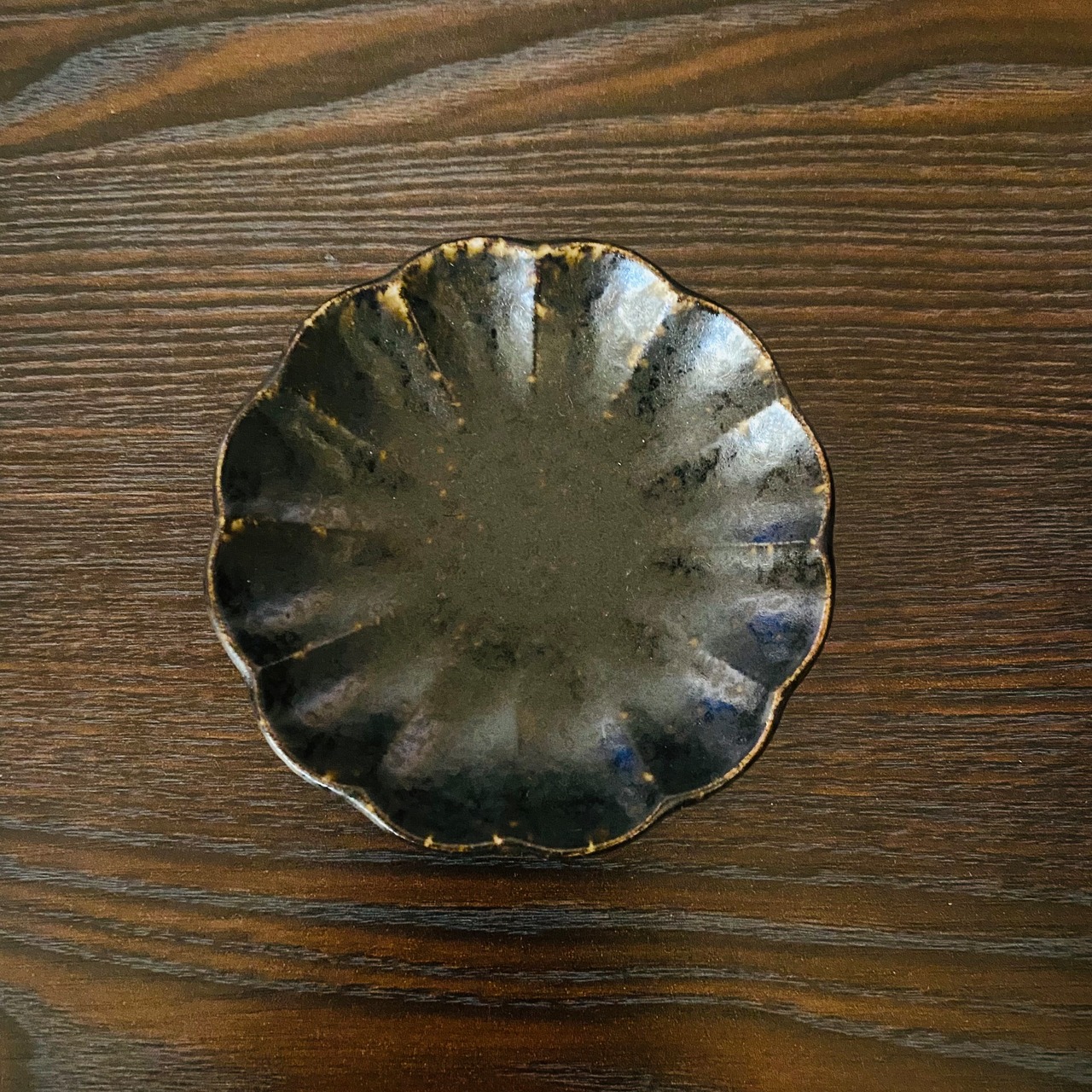艶のない渋い色の菊花皿。サイズはΦ9.7cmです。