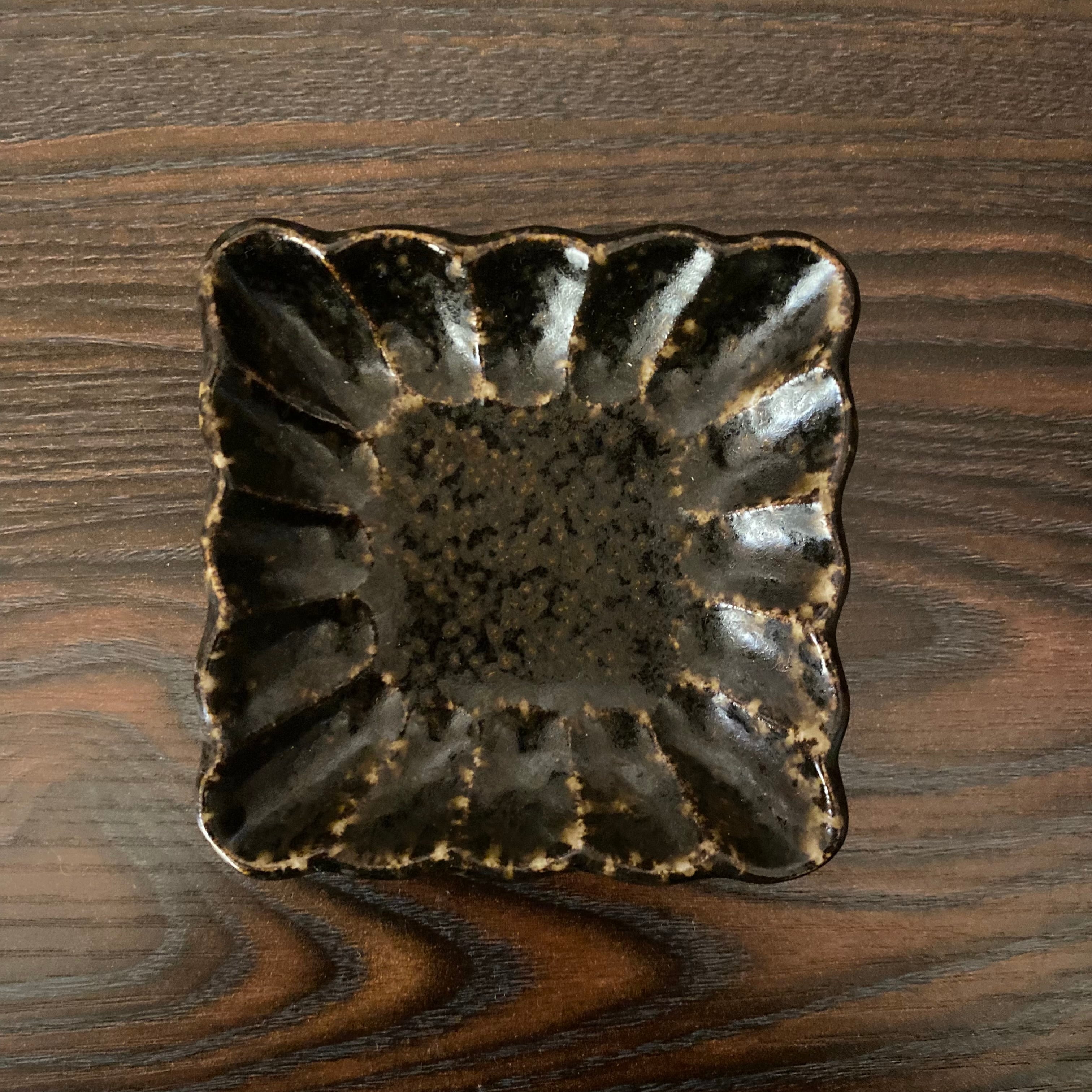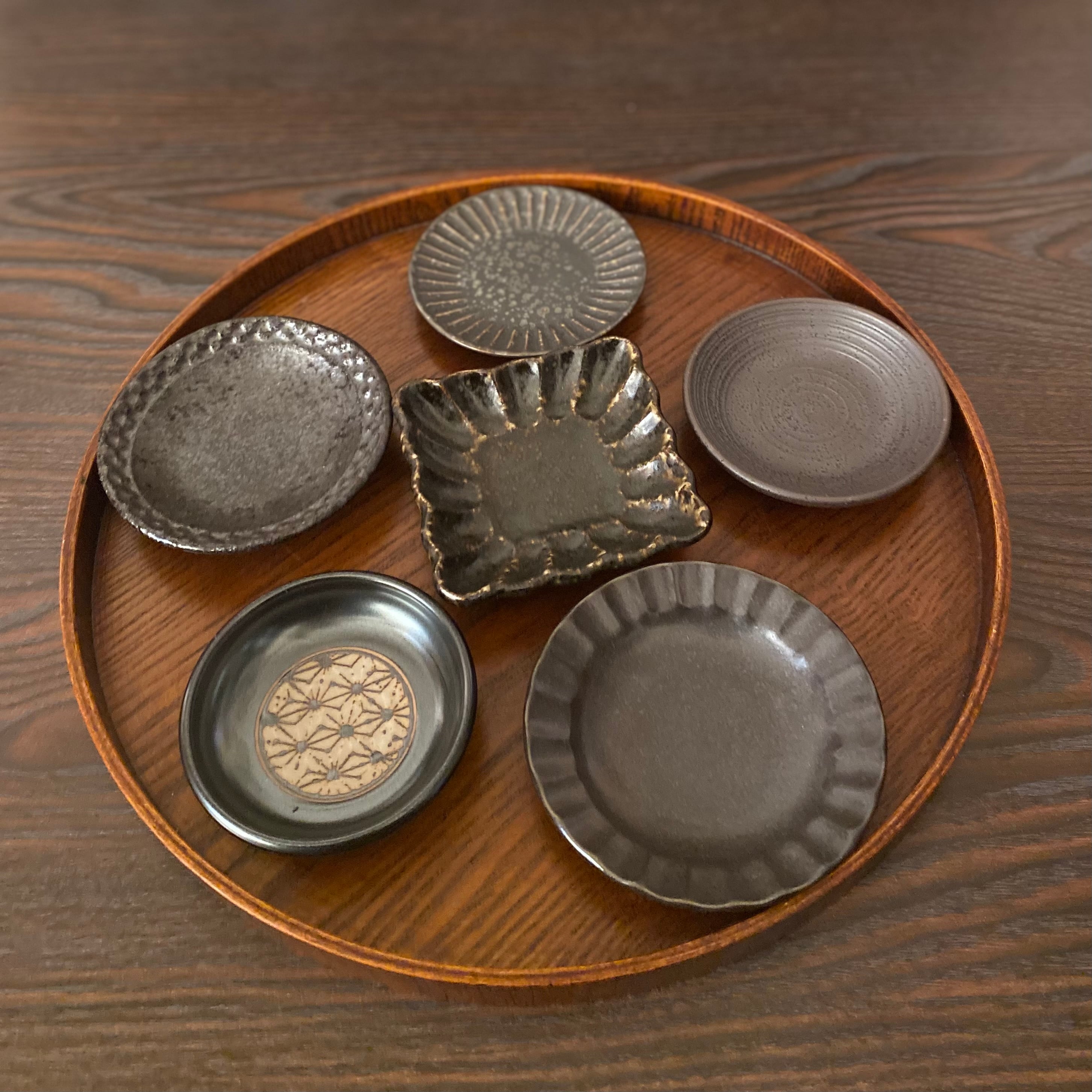 豆皿6個セット。落ち着いた黒系の皿のみを集めてました。菊黒角皿、しのぎ溶岩流、茶結晶、黒市松彫、黒結晶しのぎ、鉄結晶麻葉小鉢、サイズはΦ8-9.4cmです。